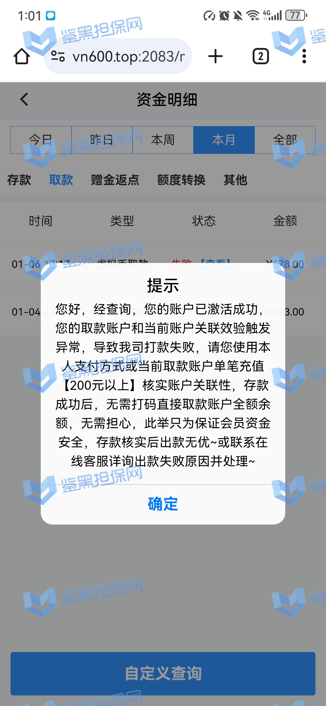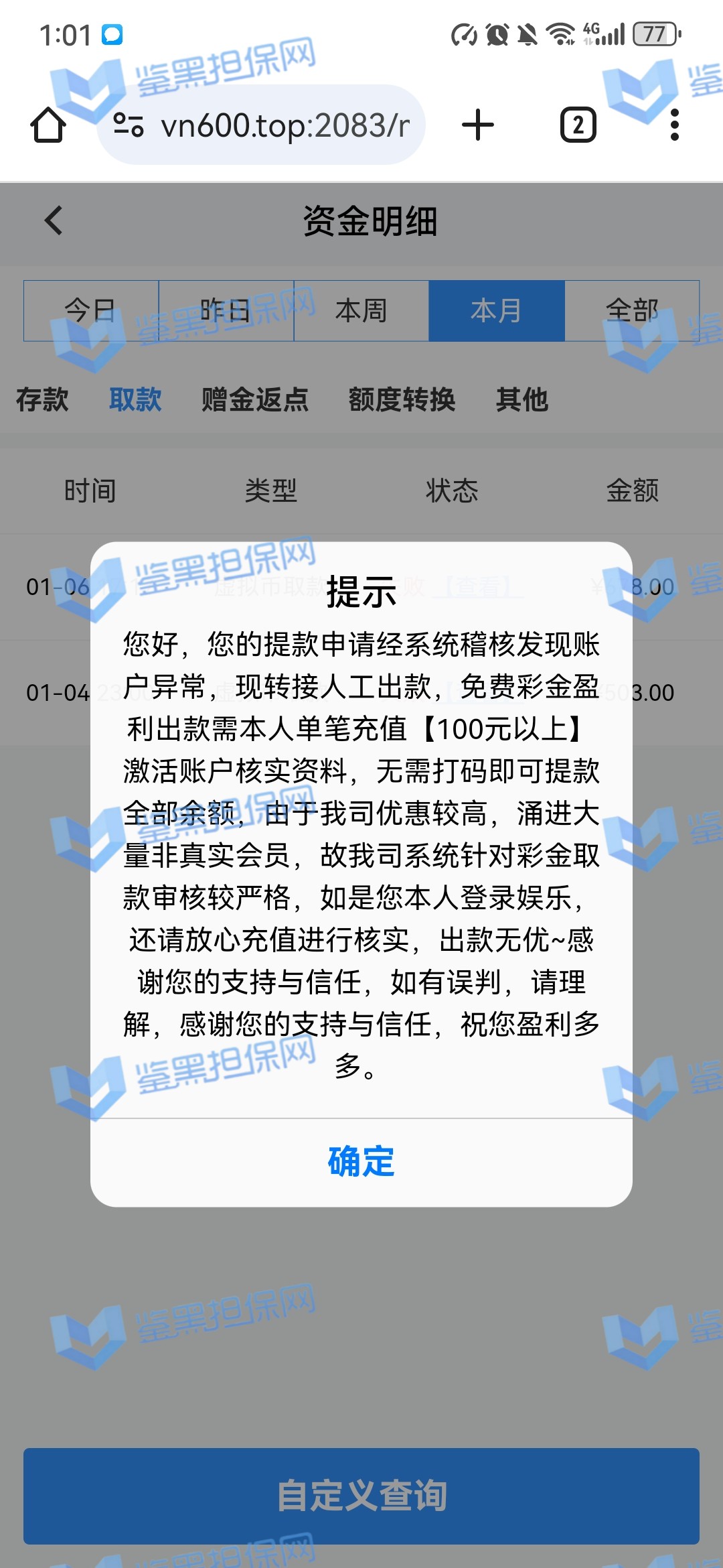 2025年1月23日下午我接到他们客服的电话邀请注册,说最高可以领288的彩金,我觉得这个平台不错挺大气的,就充了500元试试水。 因为他们平台我看是要求一倍流水提现,所以我就打到1300元申请了第一次提现,结果失败了,他们客服说让我打注册彩金288的5倍1440元才能提款,我就去他们指定的PG电子去打流水,当天晚上打够流水以后找他们提款再次失败,又改口说要打够提现余额的1300*5倍=6500元的流水才能提现。从第二次给我退回来以后他们给我后台修改了PG电子的赔率,损失从15%提高到50%,我一算账根本不够,然后我就又去打了百家乐,想着输完就不提,赢了就去刷流水,也是运气好,从1300元梭哈到5000多元,回来刷了一晚上的PG电子,一直到1月24日的中午,才刷够流水。1月23日刷了2000多流水亏了300多,差不多15%的亏损,第二天刷了4000多亏损超过2300元,我也没说什么,想着打够就提现吧。然后1月24日我去申请提现,客服先给我提了个88元,然后再提的时候以不足vip1为由让我继续充值700元到vip1,我又充了700,然后又去申请提现,提现后又给我拒绝了,说要我再充值1000元才能使用钱包收款,这回已经引起我的警觉了,我就和他们客服再三确认,这回充1000一定没问题了吧!他们客服拍着胸脯说百分之百一定能提现,给我保证,我就又充了一千。冲进去以后我申请提现又失败了,理由是资金风控让我再充值余额一半的钱也就是4000多元解除风控(我的资金是工资卡没有任何问题),他们客服就变成了复读机,一直让我继续充值,我说什么都没用,我说刚才不是百分之百能提现成功吗?他们也不理我,说这次百分之百能提成功。所以他们平台是输了钱算我倒霉,赢了钱就开始连环套路骗钱的骗子平台 以下是我经过技术手段查到的该平台的所有域名(我本人是计算机科班出身) 威尼斯人: wn88.vip vn600.top vn601.top vn602.top vn603.top vn604.top vn605.top vn606.top vn607.top vn608.top vn609.top vn610.top wn880.top wn881.top wn882.top wn883.top wn884.top wn885.top wn886.top wn887.top wn888.top wn889.top wn890.top wn891.top wn892.top wn893.top wn894.top wn895.top wn896.top wn897.top wn898.top wn899.top vn4456.com vn4457.com 81157.cc 元大娱乐城(同一个主体运营的另一家平台): yd7575.com yd9568.com yd3637.com yd3690.com yd5748.com yd9928.com yd3657.com yd2234.com yd1238.com yd1239.com yd1237.com yd2235.com yd1230.com yd1236.com yd1235.com